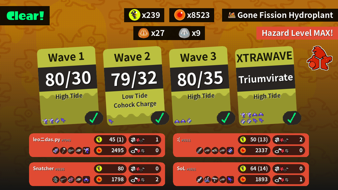 | Weapons |  Glooga Dualies  Octobrush  Nautilus 47  Grizzco Brella |  Wellstring V  N-ZAP '85  Dapple Dualies  Grizzco Brella |  Mint Decavitator  Slosher  Splat Roller  Grizzco Charger |  Splatana Stamper  Grizzco Charger  Grizzco Blaster  Grizzco Charger |