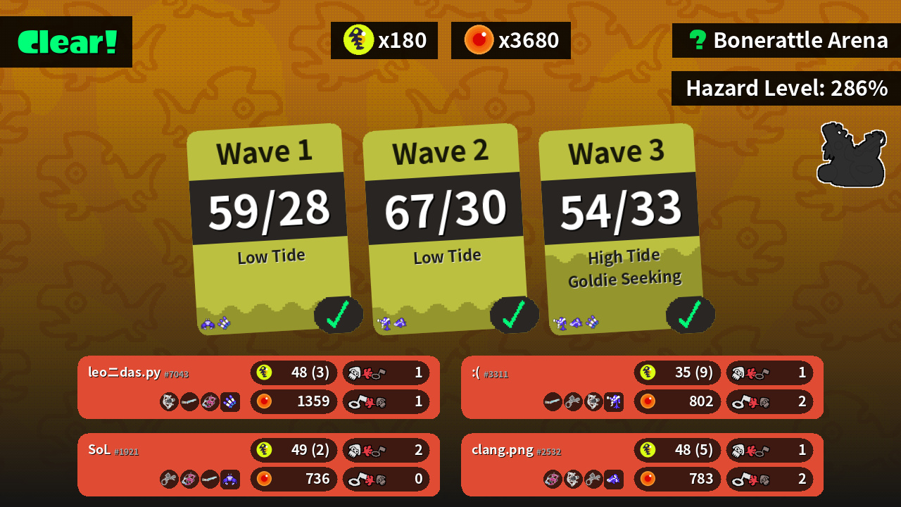 | Weapons |  REEF-LUX 450  Classic Squiffer  Dapple Dualies |  Aerospray MG  Dapple Dualies  Classic Squiffer |  Dapple Dualies  REEF-LUX 450  Aerospray MG |  Classic Squiffer  Aerospray MG  REEF-LUX 450 |