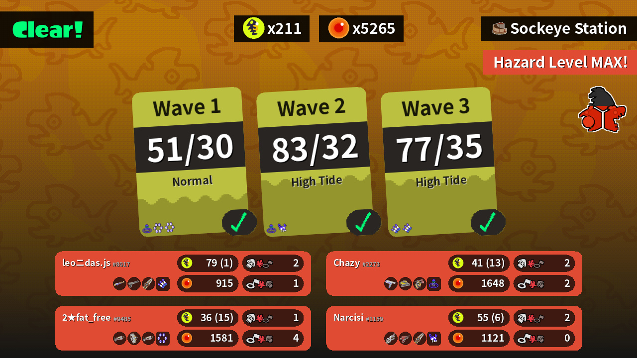 | Weapons | Splat Charger N-ZAP '85 Grizzco Splatana | Dark Tetra Dualies Dualie Squelchers Grizzco Splatana | Big Swig Roller Dread Wringer Douser Dualies FF | Grizzco Charger Grizzco Stringer Grizzco Charger |