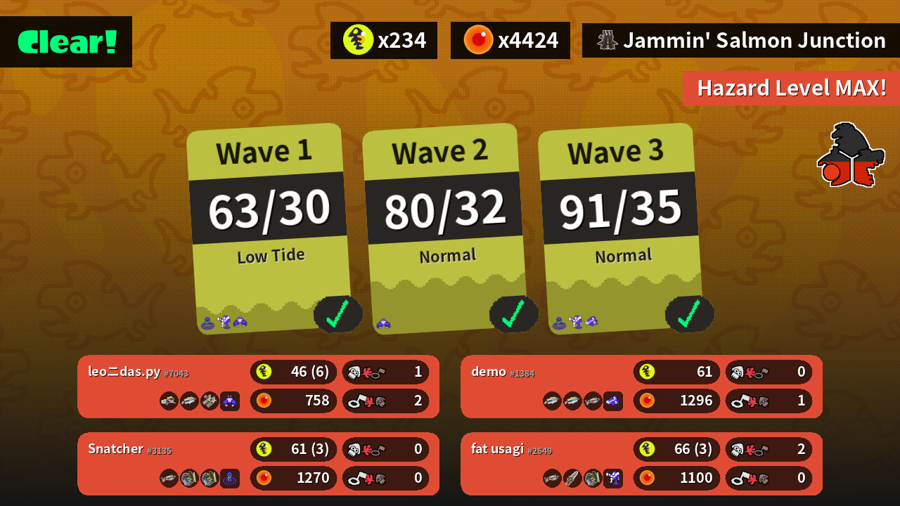 | Weapons | Grizzco Blaster Grizzco Brella Grizzco Dualies | Grizzco Charger Grizzco Splatana Grizzco Slosher | Grizzco Brella Grizzco Brella Grizzco Charger | Grizzco Charger Grizzco Slosher Grizzco Slosher |
