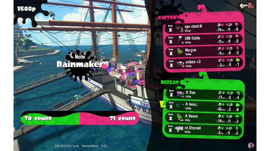 | Name | Weapon | Level | Rank | Inked | k+a/sp | k/d |