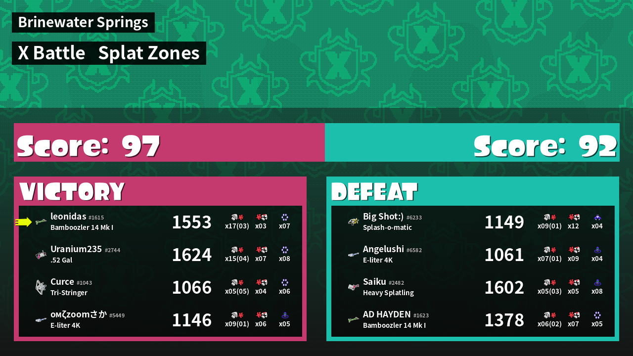 | Medals | #1 Overall Splatter #1 Splat Zone Inker #1 Splat Zone Guard | ||