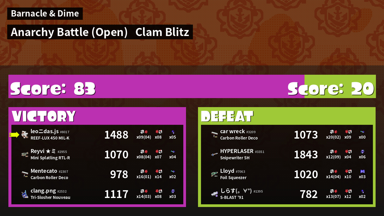 | Mode | Clam Blitz - Anarchy Battle (Open) | ||
