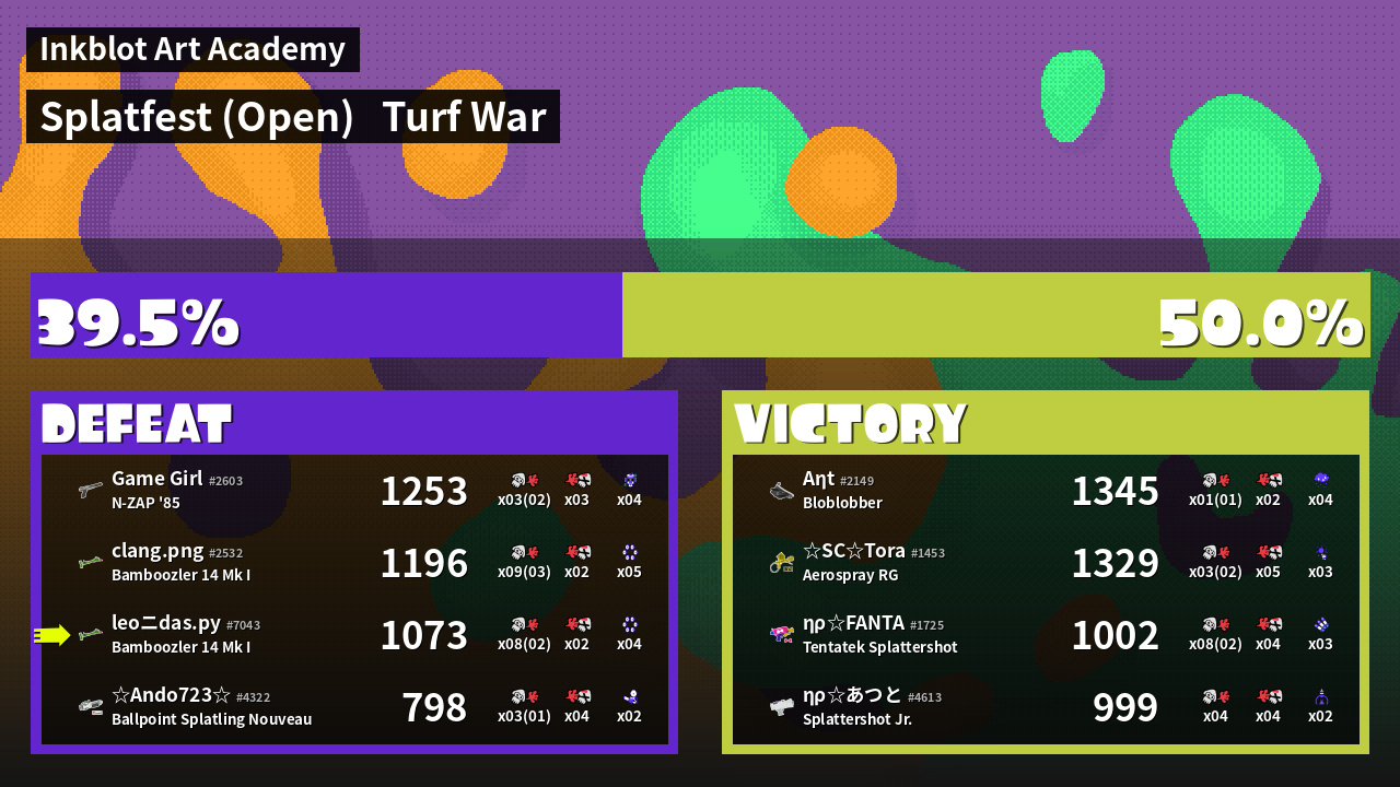 | Medals | #1 Popular Target #1 Enemy-Base Inker #1 Enemy Splatter | ||