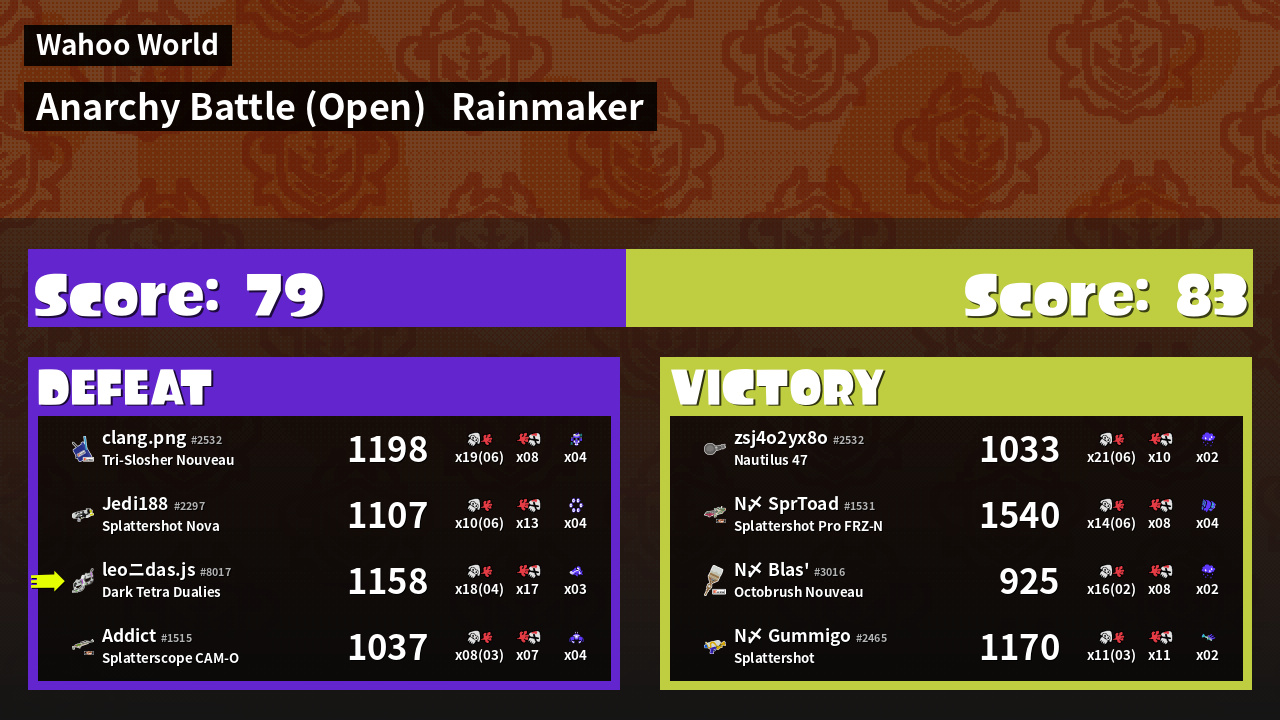 | Mode | Rainmaker - Anarchy Battle (Open) | ||