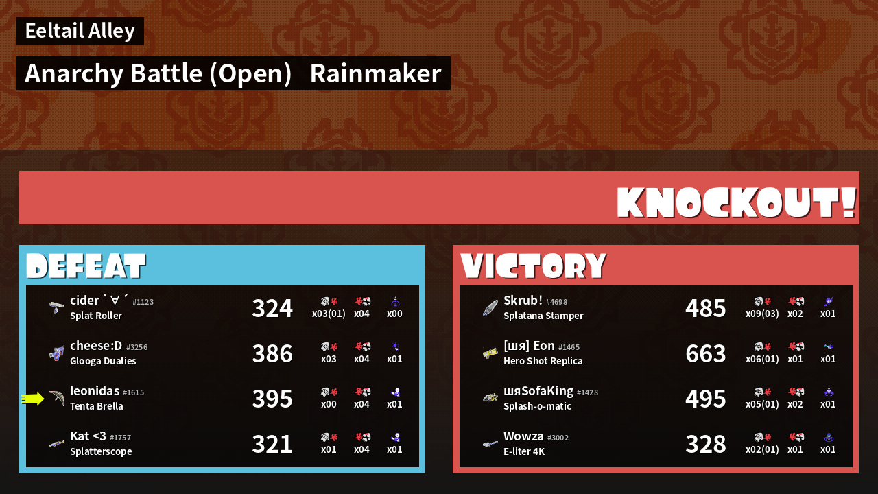 | Fishy Fisherfolk cider `∀´ #1123 |  Splat Roller                    | 324 | 2 + 1 | 4 | 0.50 |  0 | |