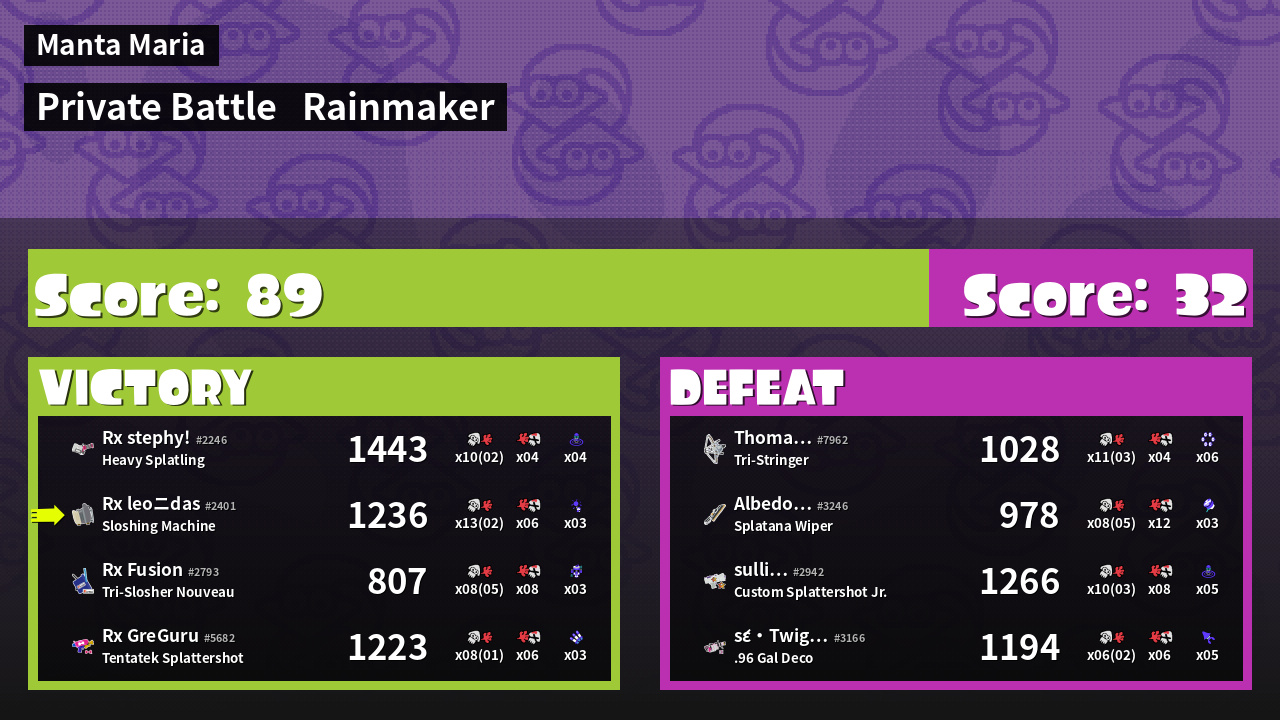 | Medals | #1 Overall Splatter #1 Enemy Splatter #1 Rainmaker Stopper | ||