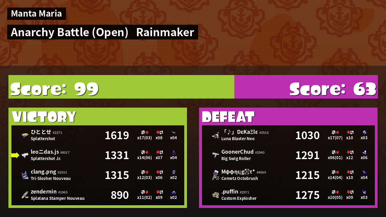 | Mode | Rainmaker - Anarchy Battle (Open) | ||