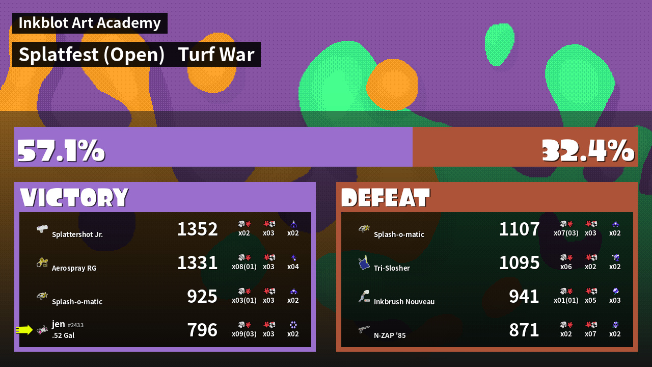 | Medals | #1 Overall Splatter #1 Popular Target #1 Enemy-Base Inker | ||