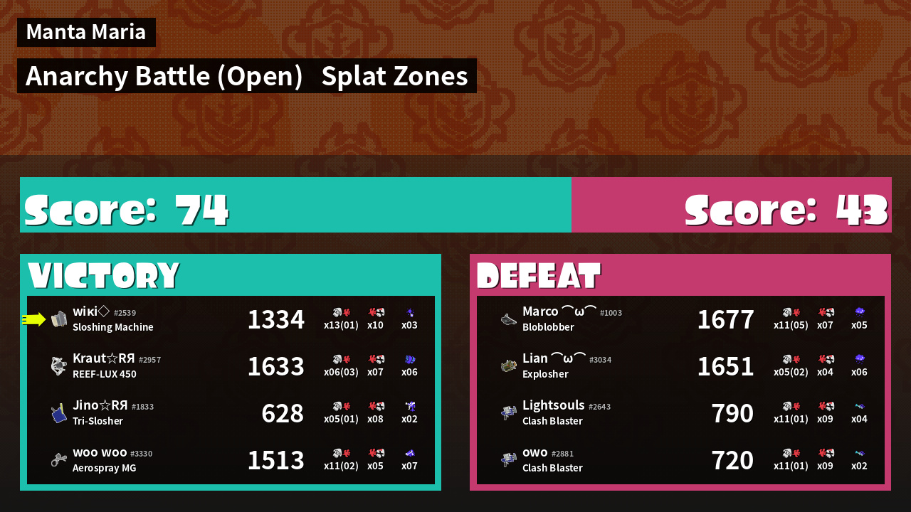 | Mode | Splat Zones - Anarchy Battle (Open) | ||