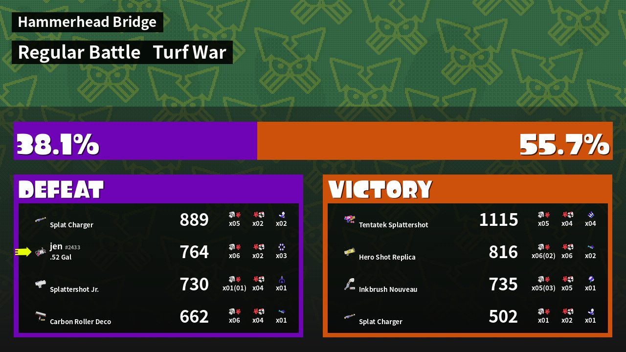 | Medals | #1 Overall Splatter #1 Enemy-Base Inker #1 Super Jump Spot | ||