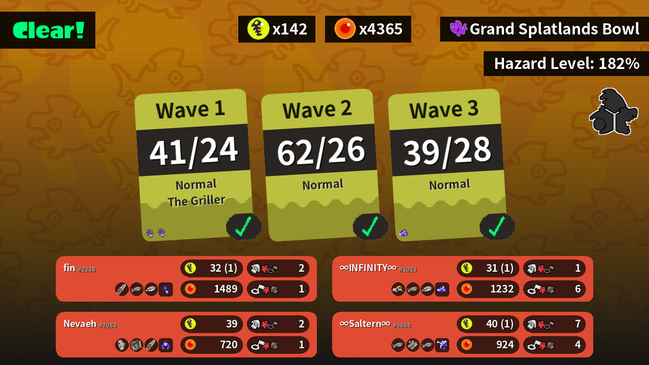 | Weapons | Grizzco Splatana Grizzco Charger Grizzco Brella | Grizzco Charger Grizzco Dualies Grizzco Charger | Grizzco Stringer Grizzco Slosher Grizzco Splatana | Grizzco Blaster Grizzco Charger Grizzco Brella |