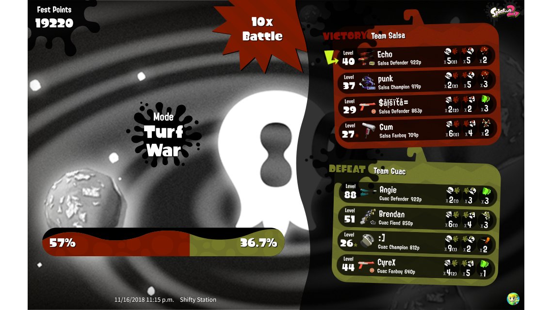 | Splatfest Title | Salsa Defender 228 → Salsa Defender 318 | ||||||||||||||||||||||||||||||||||