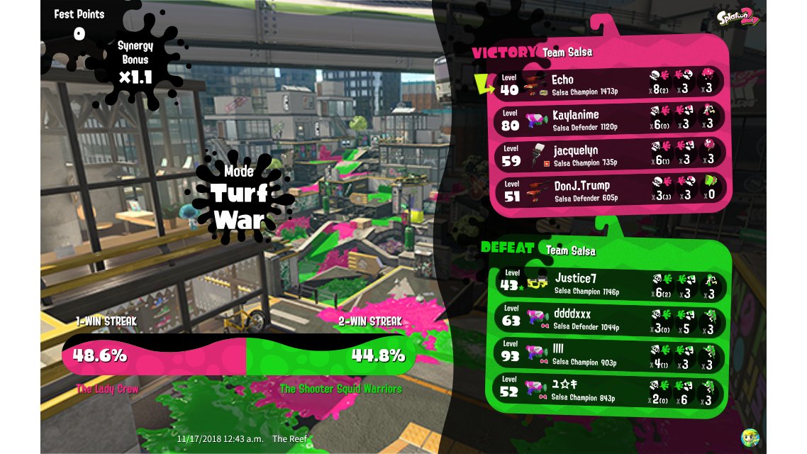 | Team Salsa The Shooter Squid Warriors Win Streak: 2 | 3,936 | 12 / 17 | 0.71 41.38% | ||||