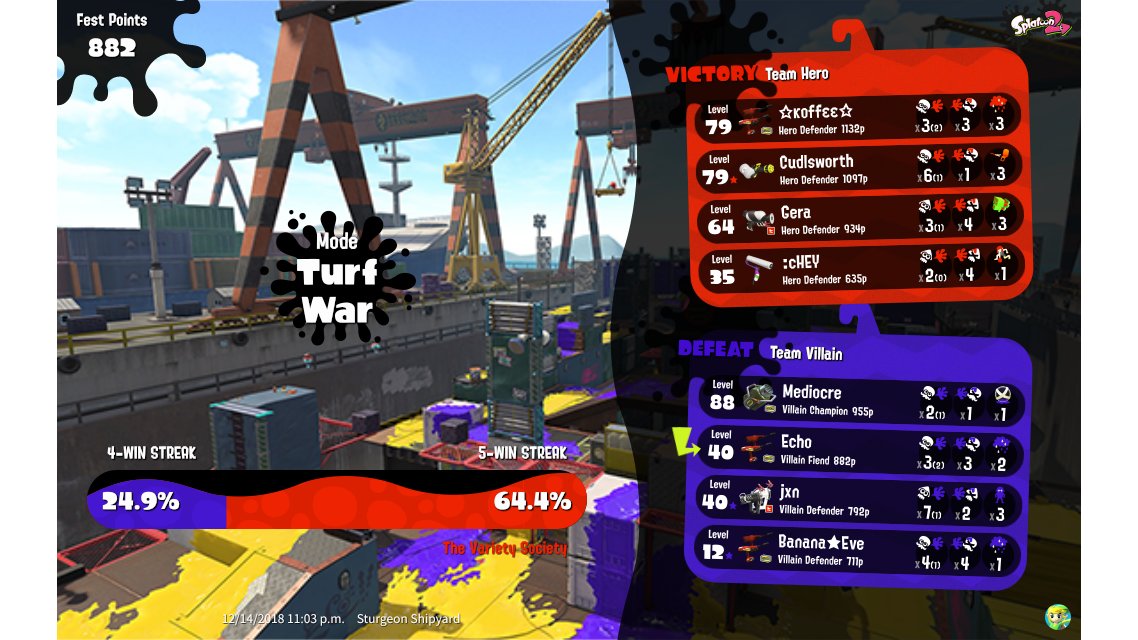 | Splatfest Title | Villain Fiend 89 → Villain Fiend 109 | |||||||||||||||||||||||||||||||
