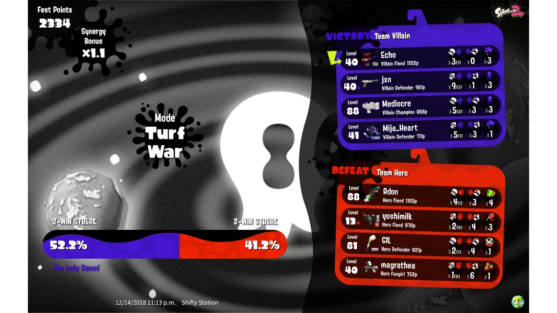 | Splatfest Title | Villain Fiend 208 → Villain Defender 57 | |||||||||||||||||||||||||||||||