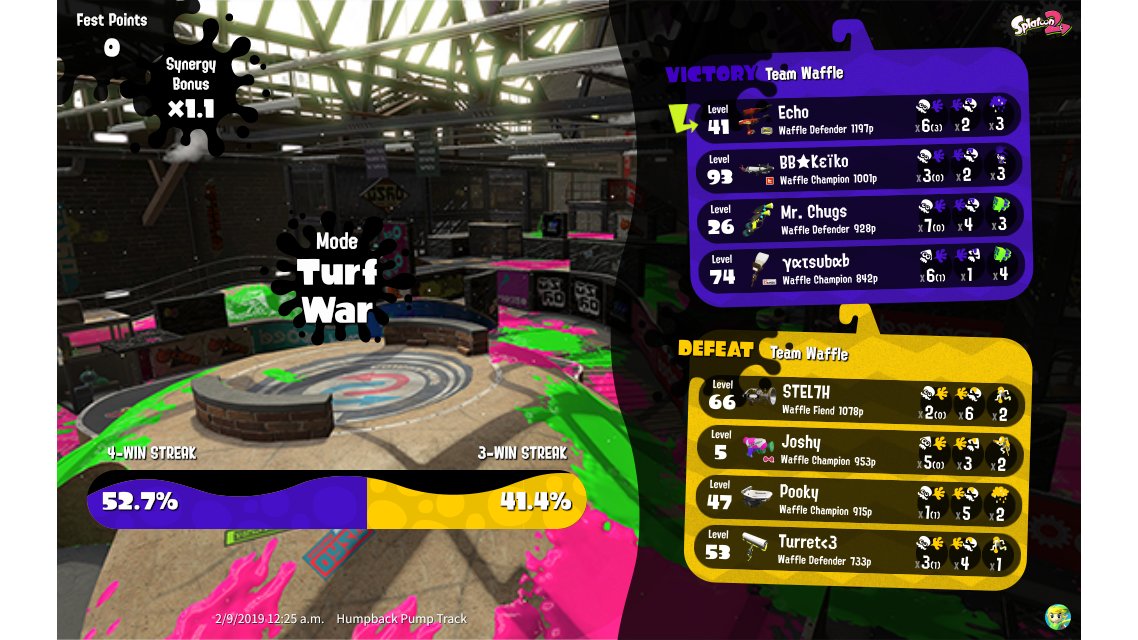 | Splatfest Title | Waffle Defender 230 → Waffle Defender 318 | |||||||||||||||||||||||||||||||
