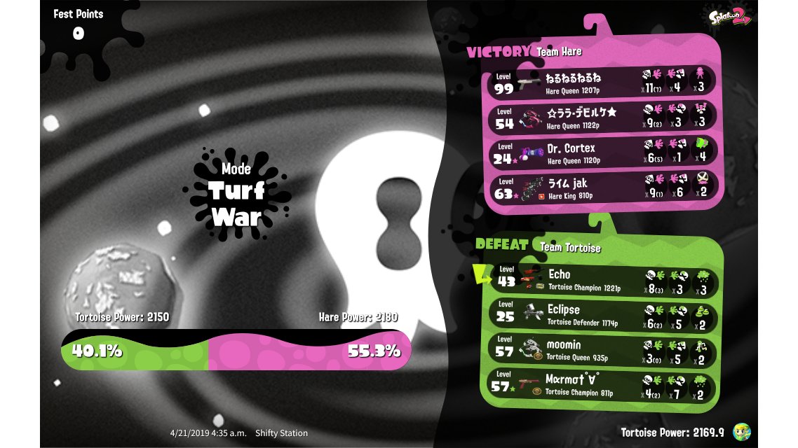 | My team's splatfest power | 2,150 | |||||||||||||||||||||||||||||||