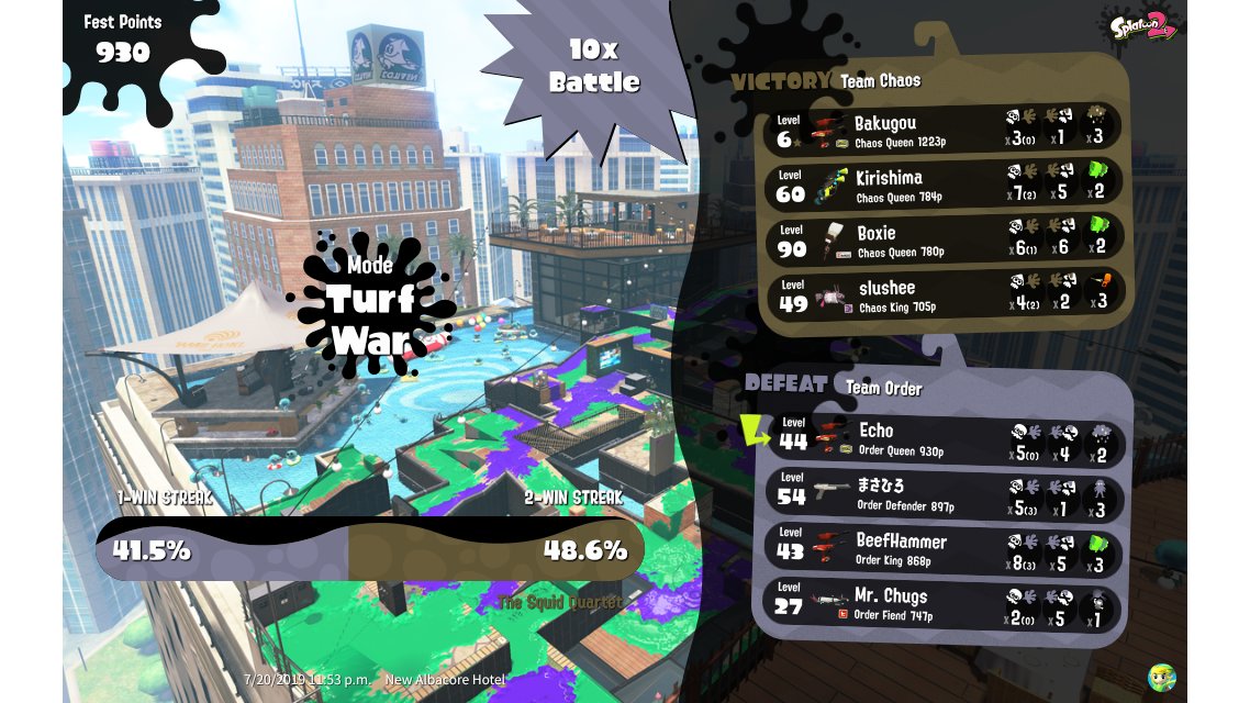 | Team Chaos The Squid Quartet Win Streak: 2 | 3,492 | 15 / 14 | 1.07 51.72% | ||||