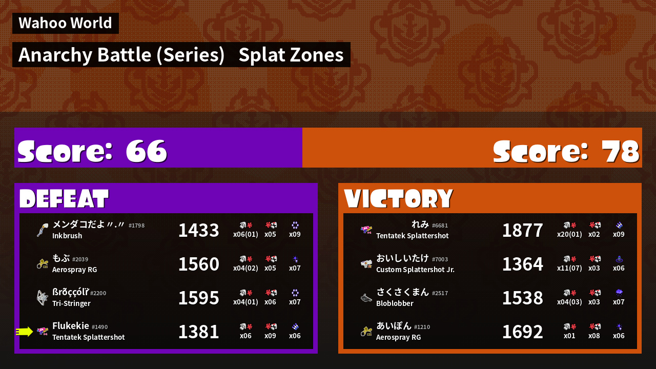 | Splatlandian Youth     れみ #6681 |  Tentatek Splattershot                    | 1,877 | 19 + 1 | 2 | 9.50 |  9 | |