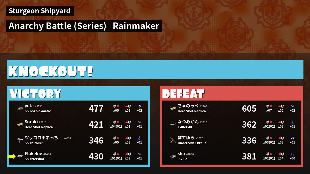 | Splatlandian Rookie yuta #1722 |  Sploosh-o-matic                    | 477 | 5 + 0 | 3 | 1.67 |  2 | |