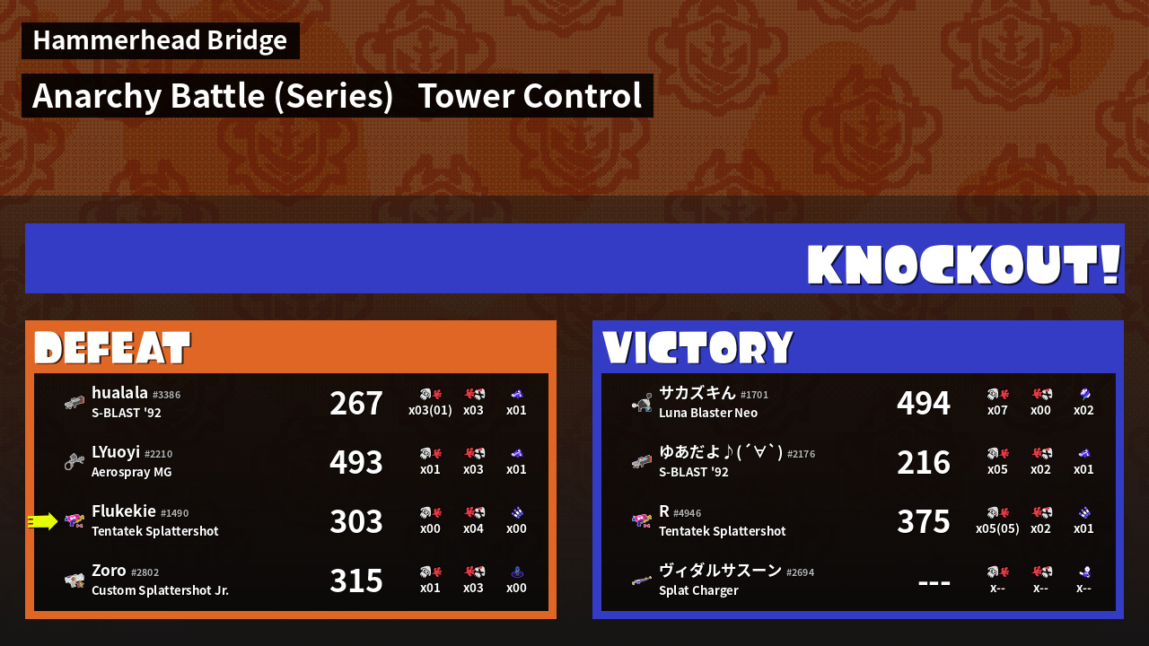 | Wannabe Agent 4 Flukekie #1490 |  Tentatek Splattershot                    | 303 | 0 + 0 | 4 | 0.00 |  0 | |