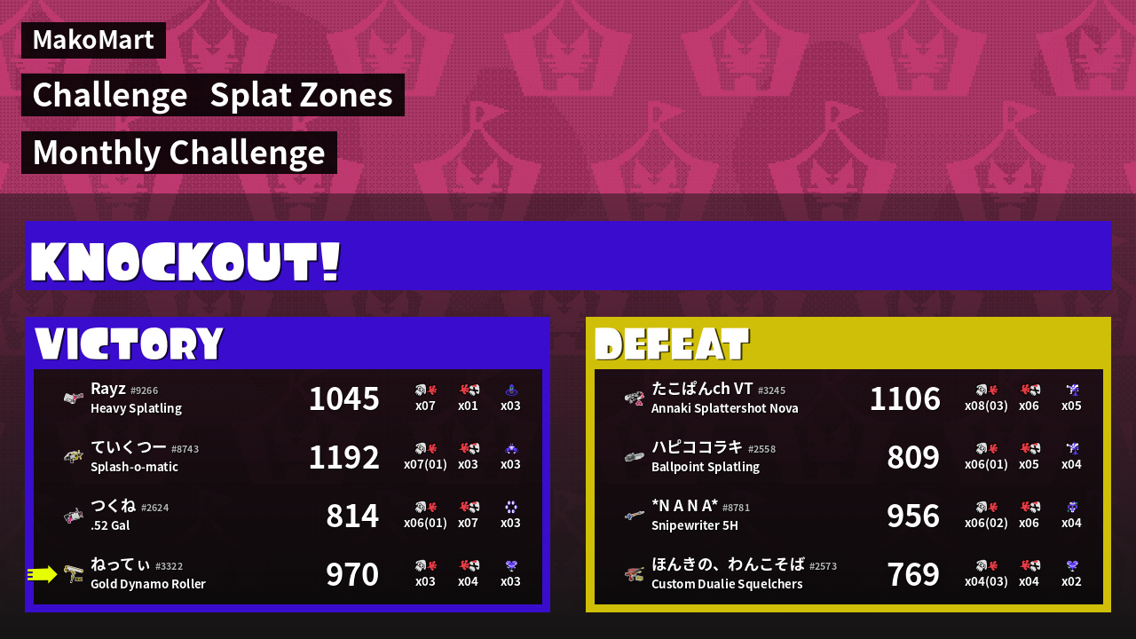 | Weapon | Gold Dynamo Roller ( Splat Bomb / Super Chump) | ||
