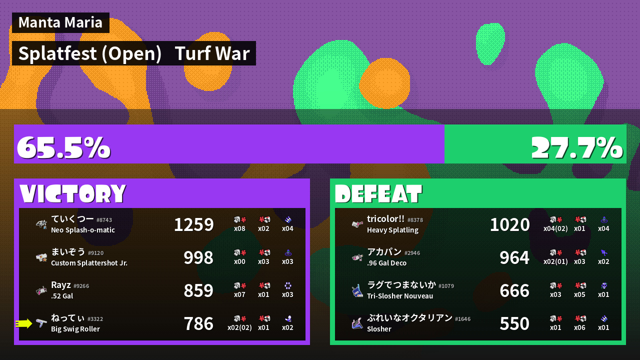 | Medals | #1 Home-Base Inker #1 Splat Assister #1 Damage Taker | ||