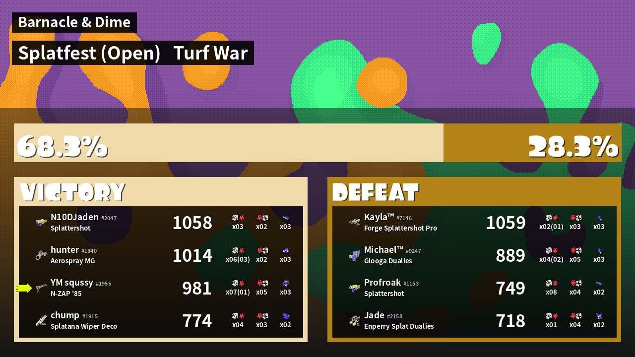 | Medals | #1 Overall Splatter #1 Enemy Splatter #1 Tacticooler User | ||