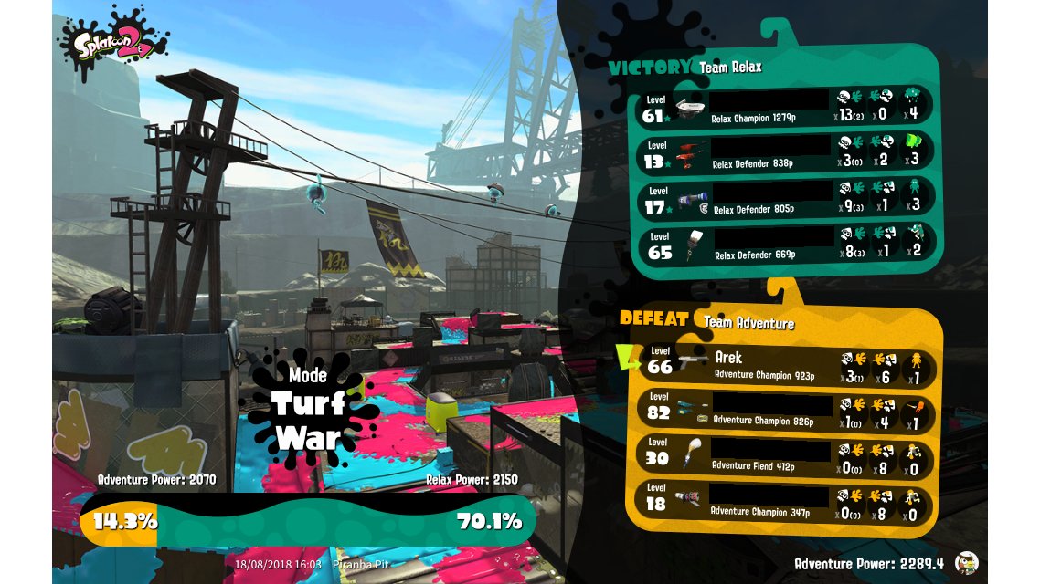 | Splatfest Title | Adventure Champion → Adventure King | |||||||||||||||||||||||||||||||||||||