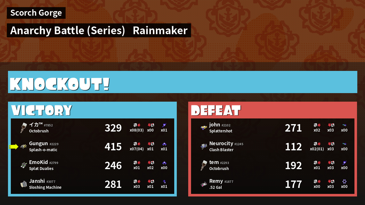 | Champion du monde classe de chez classe EmoKid #2799 |  Splat Dualies     | 246 | 1 + 0 | 2 | 0.50 |  0 | |