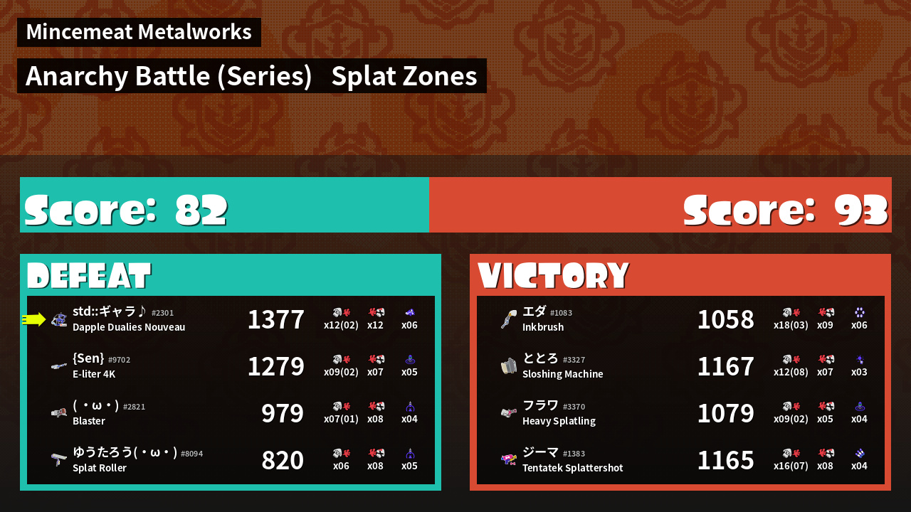 | Medals | #1 Overall Splatter #1 Splat Zone Guard #1 Turf Inker | ||