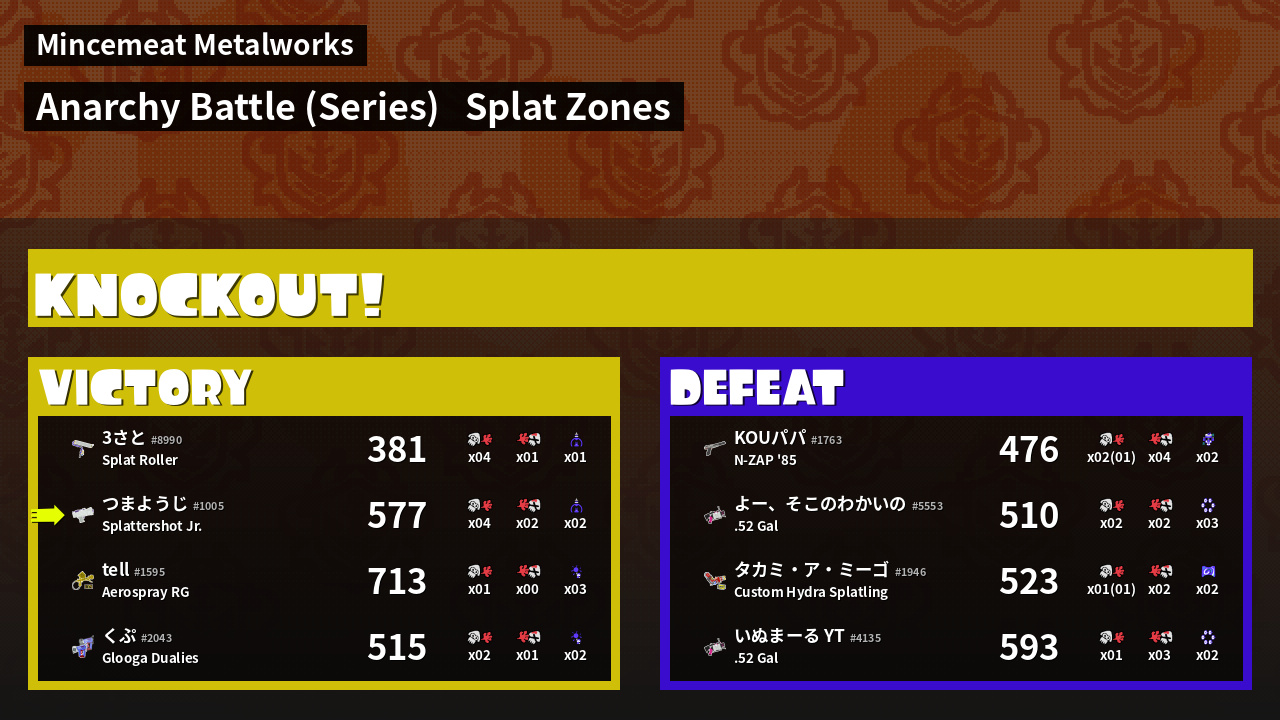 | Medals | #1 Overall Splatter #1 Splat Zone Guard #1 Enemy Splatter | ||