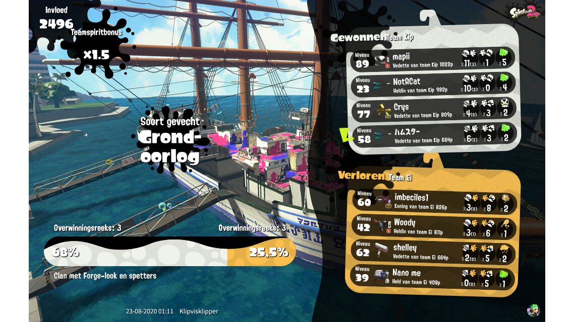 | Team Kip Clan met Forge-look en spetters Win Streak: 3 | 3,477 | 24 / 7 | 3.43 77.42% | ||||
