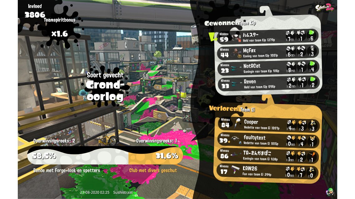 | Team Kip Bende met Forge-look en spetters Win Streak: 2 | 4,012 | 16 / 5 | 3.20 76.19% | ||||