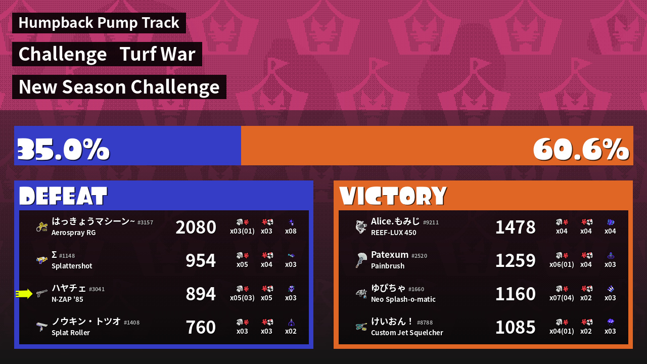 | Medals | #1 Overall Splatter #1 Enemy-Base Inker #1 Splat Assister | ||