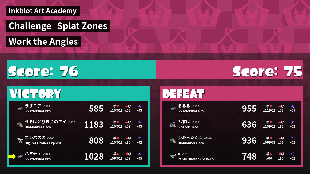 | Medals |   #1 Splat Zone Guard  #1 Damage Taker  #2 Turf Inker | ||