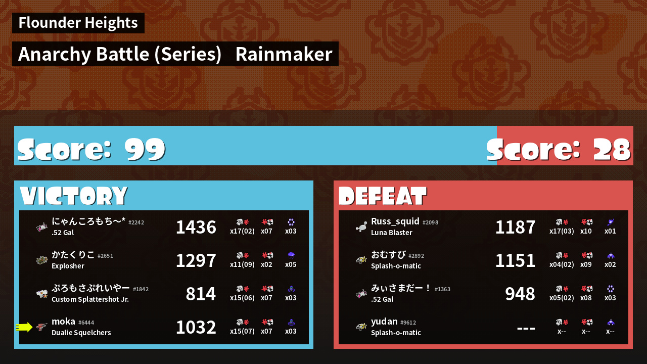 | Medals | #1 Ink Consumer #1 Wave Breaker User #2 Overall Splatter | ||