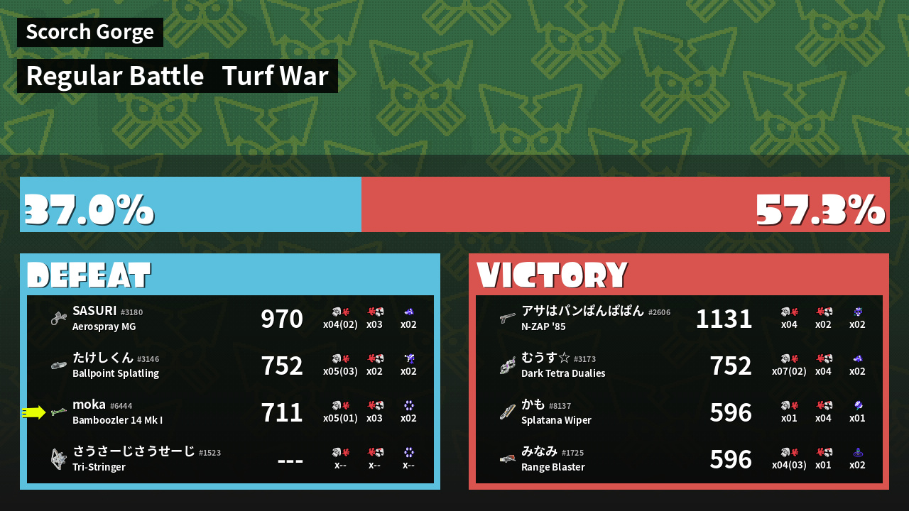 | Medals | #1 Overall Splatter #1 Enemy-Base Inker #1 Super Jump Spot | ||