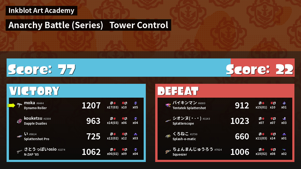 | Medals | #1 Overall Splatter #1 Turf Inker #1 Enemy Splatter | ||