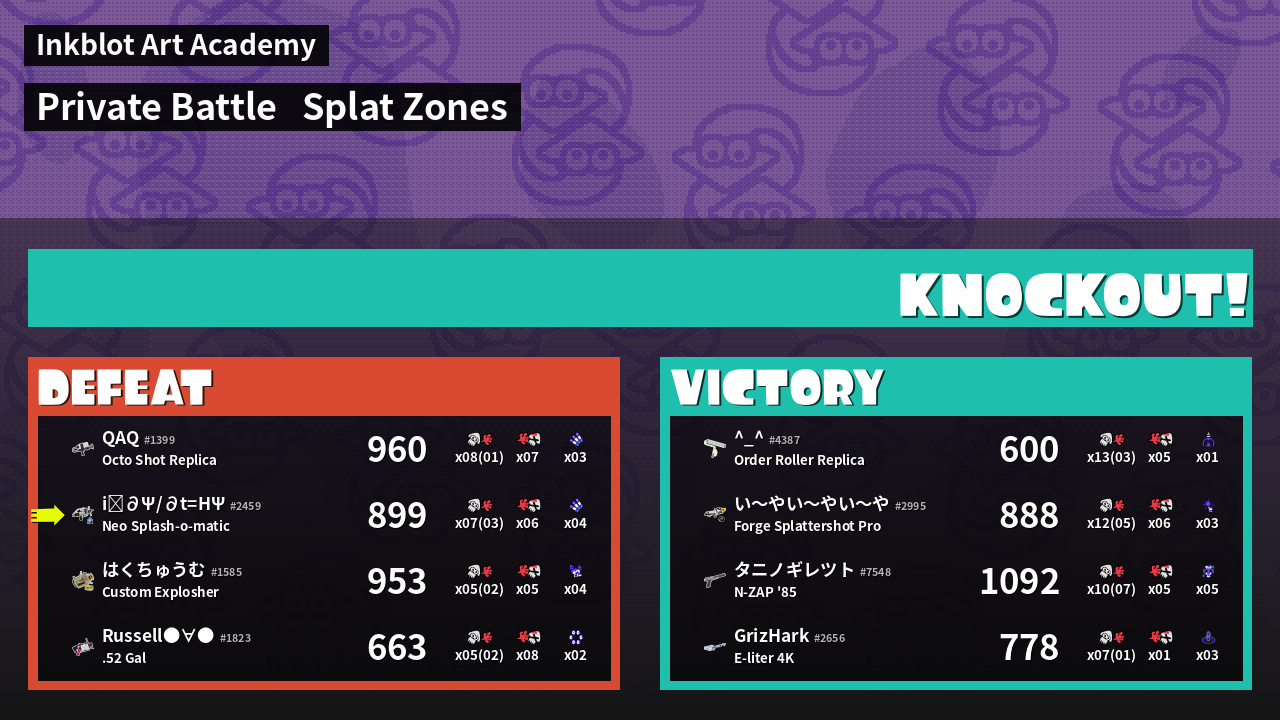 | Medals | #1 Splat Zone Guard #1 Splat Assister #1 Ink Consumer | ||