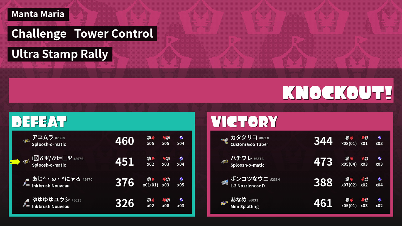 | Weapon | Sploosh-o-matic ( Curling Bomb / Ultra Stamp) | ||
