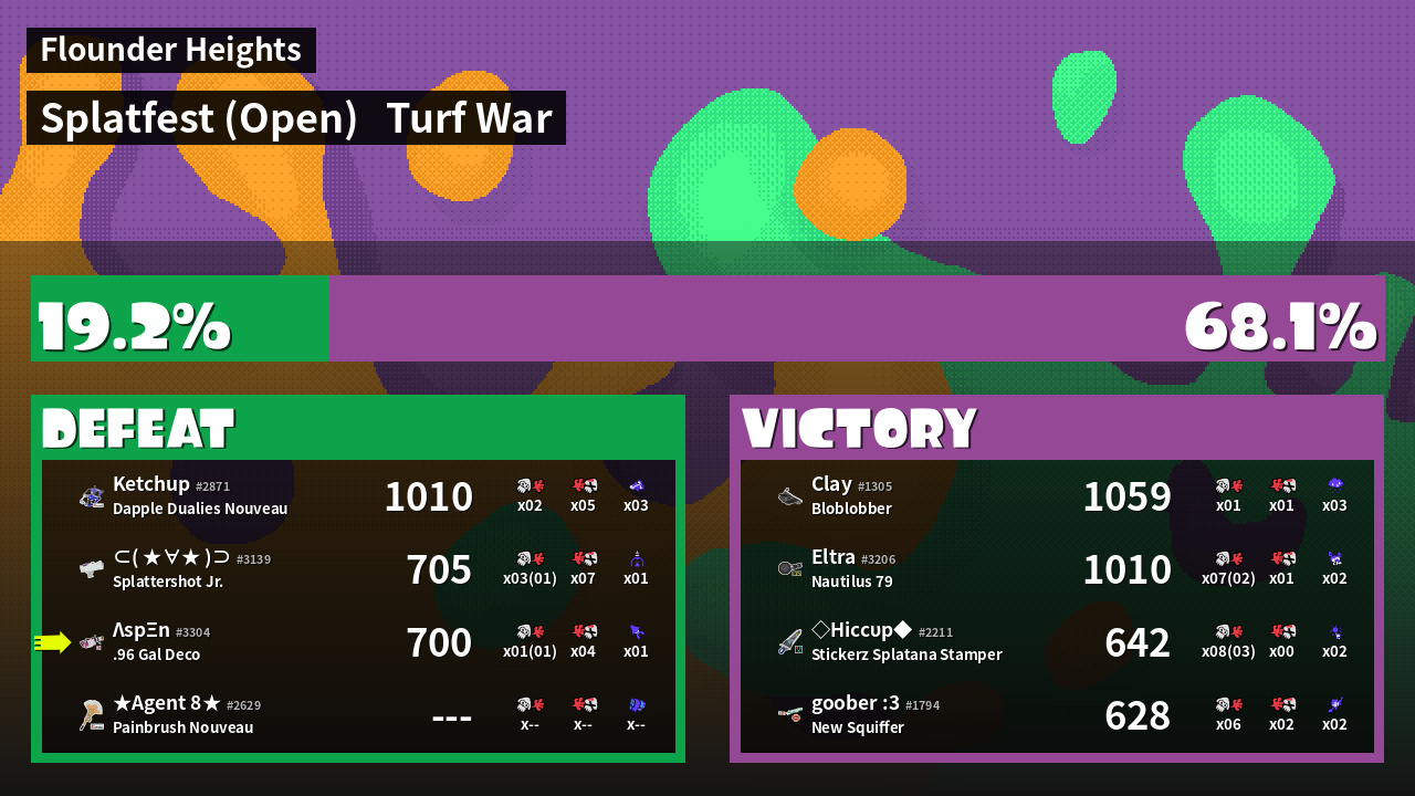 | Medals | #1 Popular Target #1 Splat Assister #1 Damage Taker | ||
