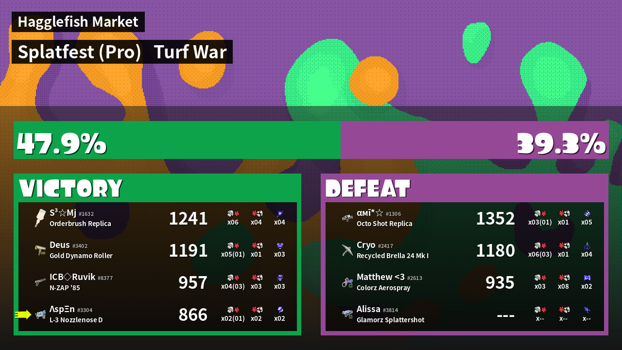 | Medals | #1 Ultra Stamp User #2 Home-Base Inker #2 Splat Assister | ||