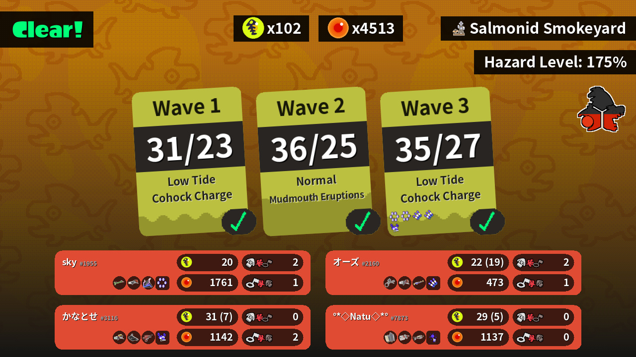 | Weapons | Bamboozler 14 Mk I Range Blaster Slosher | Grizzco Blaster Bloblobber Dualie Squelchers | Sloshing Machine Heavy Edit Splatling Grizzco Charger | Aerospray MG Blaster Splat Charger |