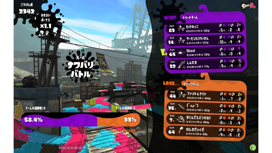 | Team トリート イカ会 Win Streak: 4 | 4,802 | 22 / 10 | 2.20 68.75% | ||||
