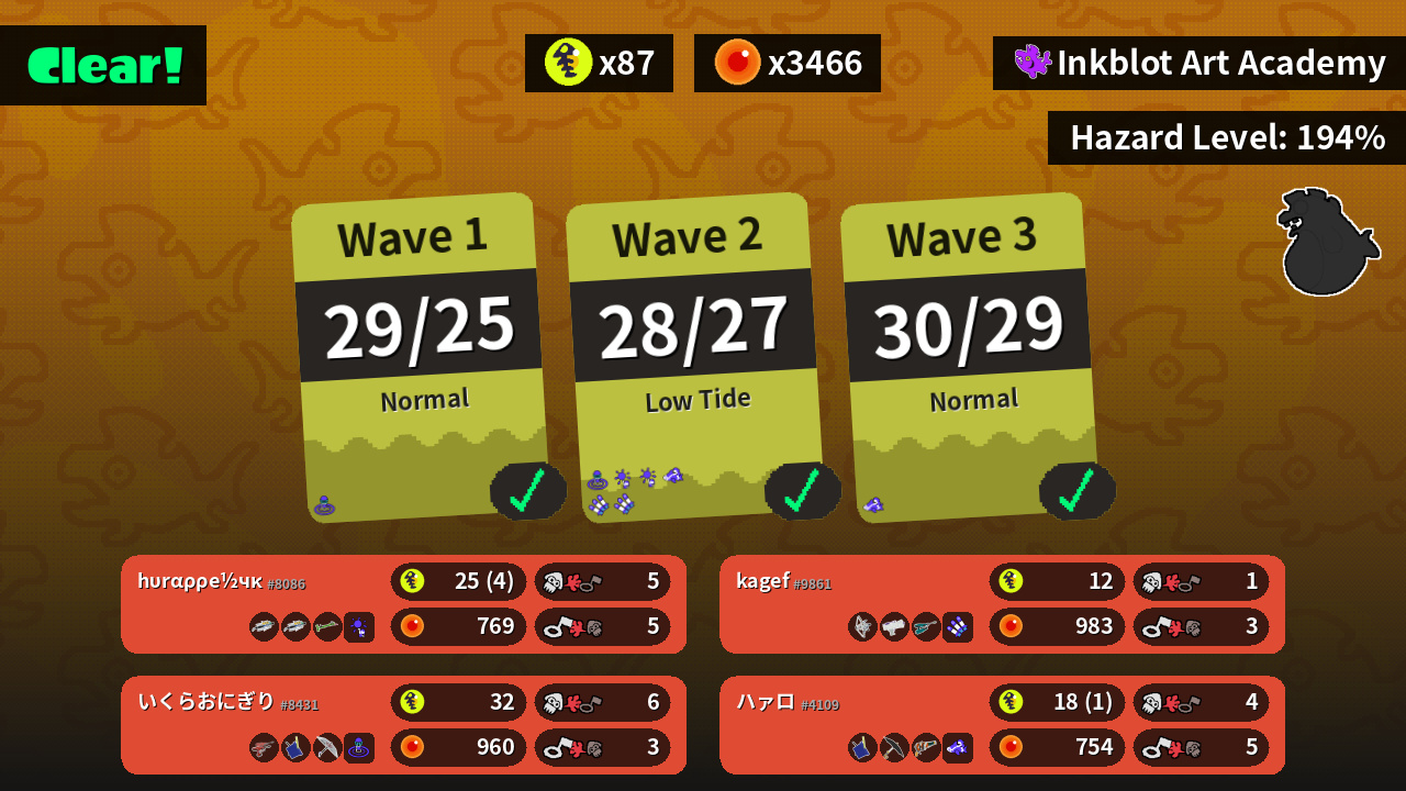 | Weapons | Grizzco Brella Grizzco Brella Bamboozler 14 Mk I | Dualie Squelchers Tri-Slosher Splat Brella | Tri-Slosher Undercover Brella Squeezer | Tri-Stringer Splattershot Jr. Jet Squelcher |