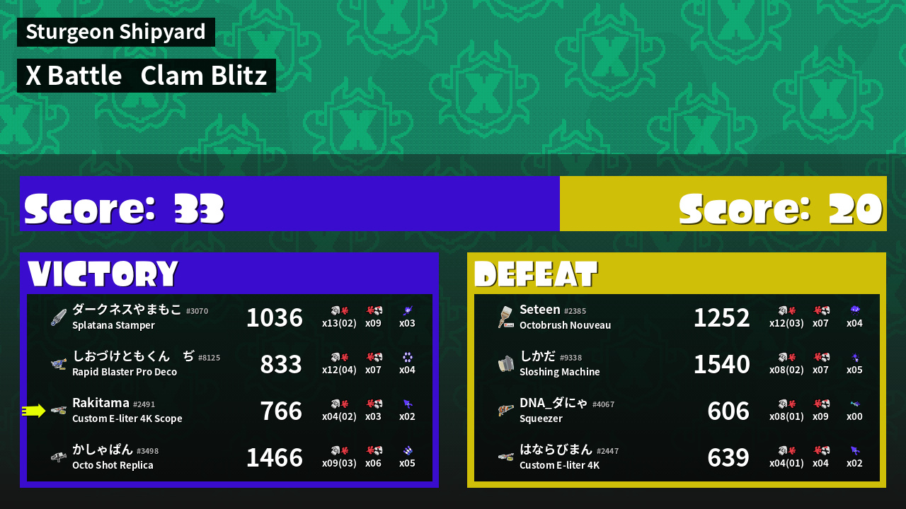 | Medals | #1 Clam Carrier #1 Super Jump Spot #1 Ink Consumer | ||