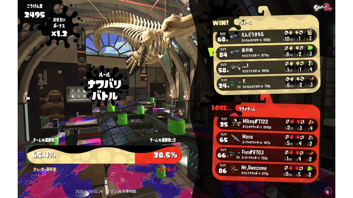 | Team マヨ シューター同好会 Win Streak: 2 | 3,966 | 16 / 6 | 2.67 72.73% | ||||
