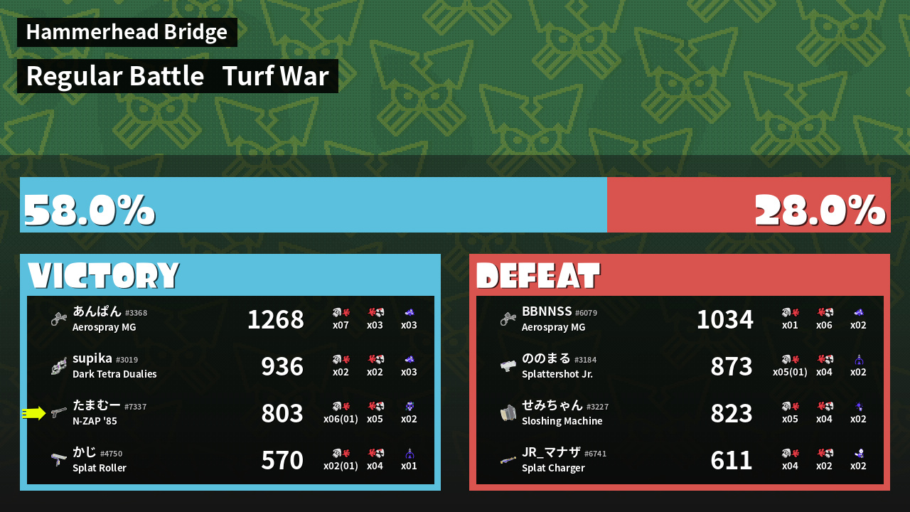 | Medals | #1 Enemy-Base Inker #1 Super Jump Spot #1 Splat Assister | ||